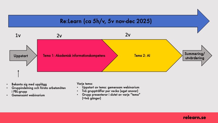 Kursen kommer att pågå i fem veckor, med start v. 45 2025. Förutom gemensamma tillfällen (ett webbinarium per tema) rekommenderas pbl-grupperna att ha två arbetsmöten per vecka. Du som deltar i kursen bör vara beredd att lägga ca fem timmar/vecka på kursen.